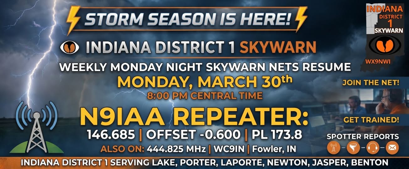 LaPorte County Skywarn Nets are now on the N9IAA 146.685 Mhz repeater. The nets are being managed by the Indiana District 1 SKYWARN Net. For years LaPorte County ran it's own net because LaPorte County falls under the National Weather Service in North Webster, while Porter County and the rest of Indiana District 1 is covered by the NWS in Chicago. Indiana District 1 SKYWARN will forward weather reports from LaPorte County to North Webster. The advantage for LaPorte County is you will hear weather reports from the west before they move in our county. If you can't hit the repeater, you can always phone in your report to the NWS. You can find them on FB at https://www.facebook.com/IND1Skywarn/