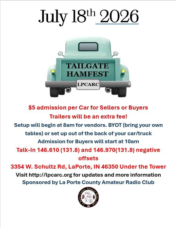 LaPorte County EMA needs your help. On the first Satuirday of each month, emergency sirens are tested and we are need of amateurs to help by monitoring a siren. The test net opens at 10:30am for checking and siren assignments. Sirens are activated at 11:00am. You can find the net on W9LY repeater 146.970